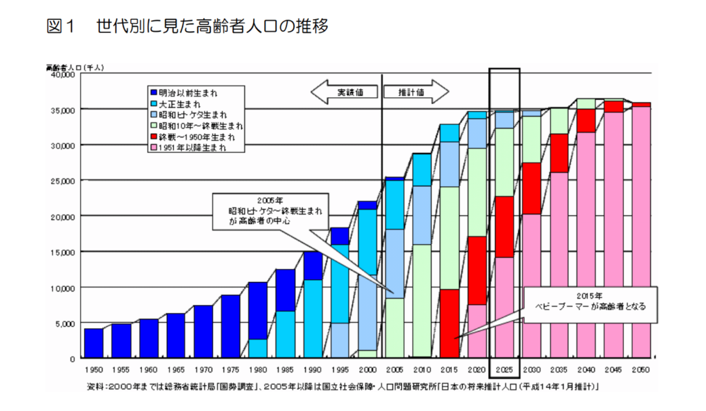 いわゆる「2025年問題」とは、人口の大きな割合を占める団塊の世代が75歳以上の後期高齢者となり、社会全体の労働人口が減少する問題です。