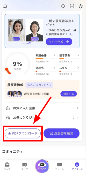 右上のアイコンをタップして「履歴書リンクをコピー」または「PDFダウンロード」をタップして英語履歴書の完成です。