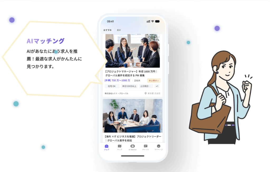 AIがあなたの経歴や希望を分析し、ENTJの強みを活かせる求人をマッチングしてくれます。