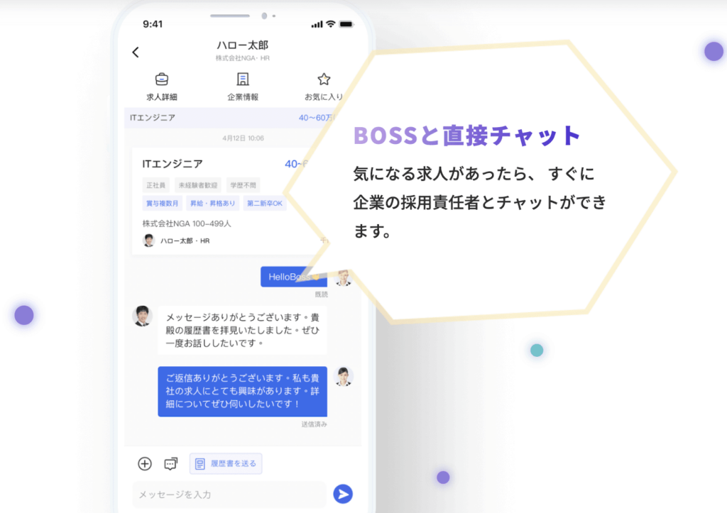 HelloBossは、採用担当者と直接やり取りができるチャット機能があります。