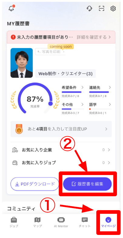 アプリ内で入力しても良いですし、PDFの履歴書がある方はHelloBossにアップロードして使えます。