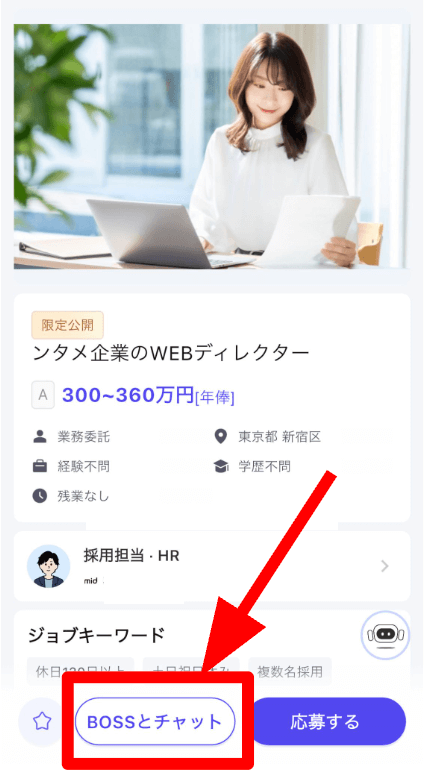 「BOSSとチャット」というボタンを押すだけで、気軽にチャットできます。