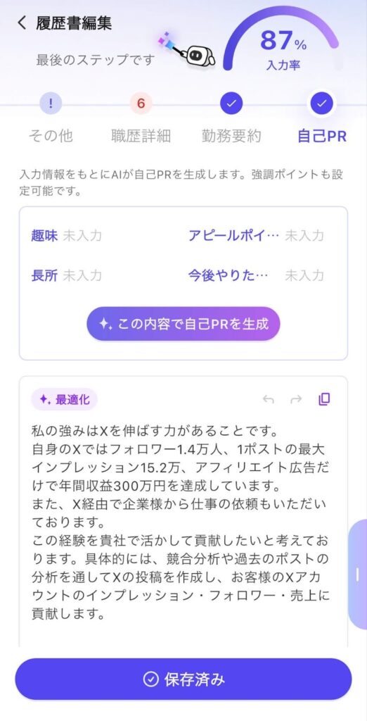 入力した履歴書の内容をもとに、自己PRを書いてくれます。