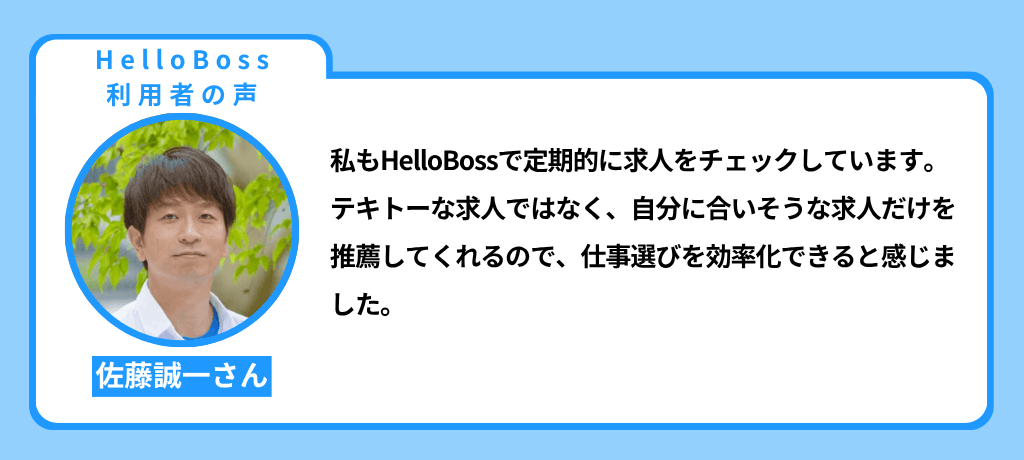 HelloBossユーザーの佐藤誠一さんも、自分に合う求人を推薦される様子に魅力を感じており、仕事探しの効率化に繋がったと話しています。