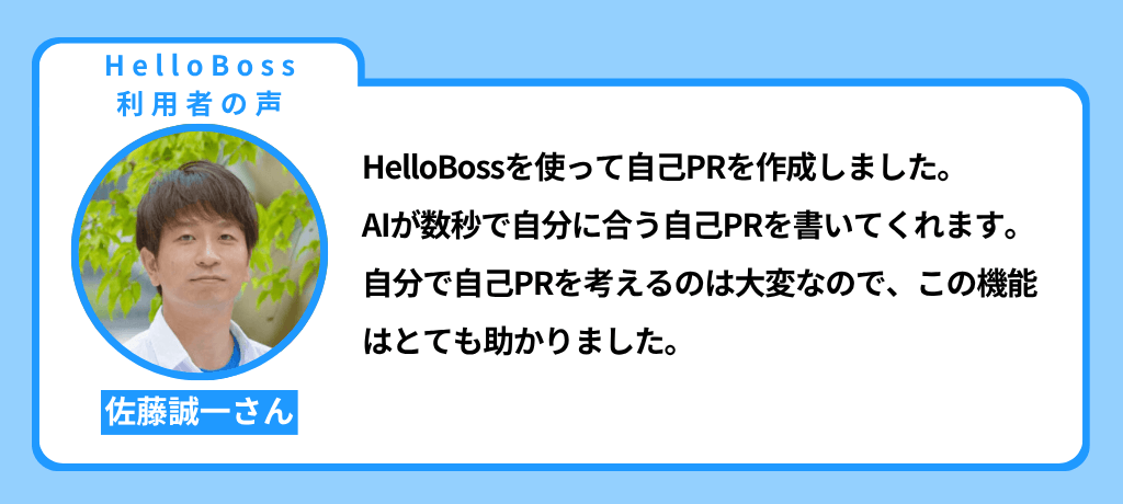 HelloBossの履歴書に基づいてAIが自己PRを作成する機能は、文章の組み立てを効率化したい方に支持されています。