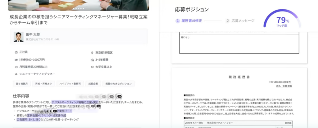 応募したい求人が決まったら、AIメンターに選考対策のアドバイスをもらいながら準備を進めていきます。