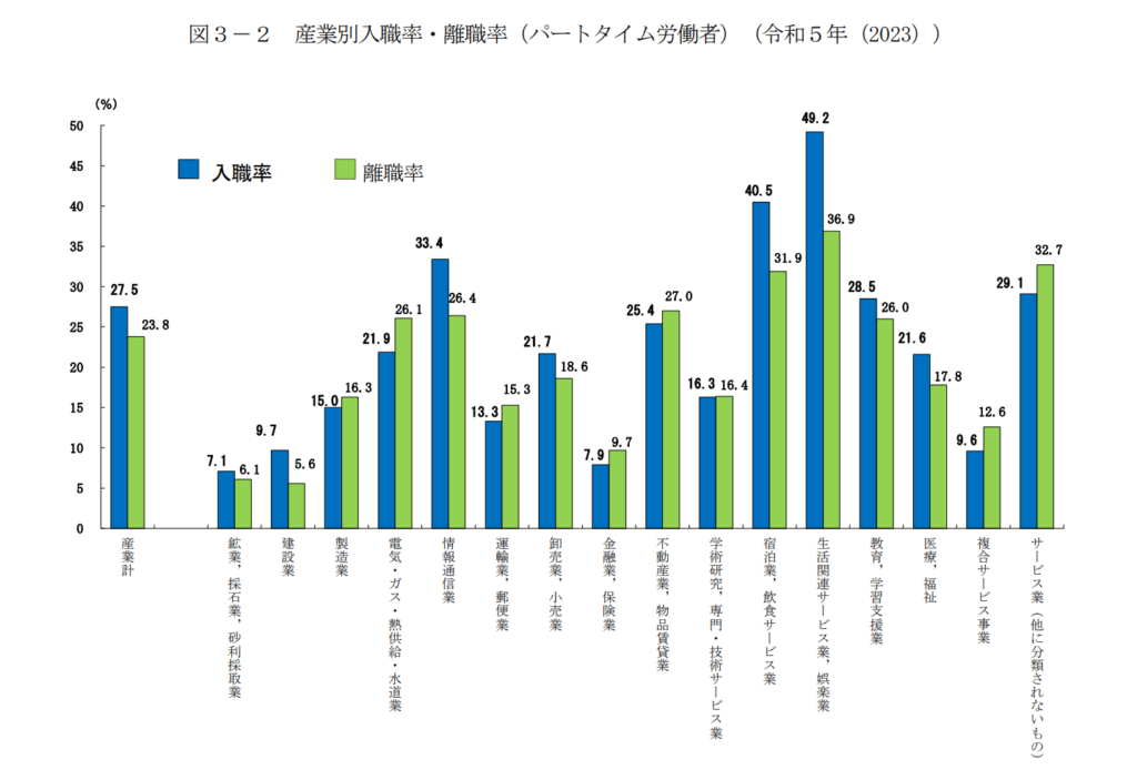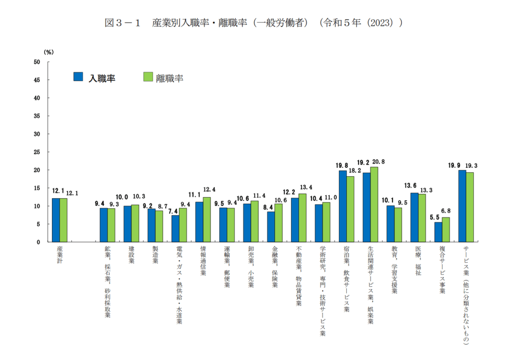 また、「生活関連サービス業, 娯楽業」の離職率は36.9%と高い水準です。