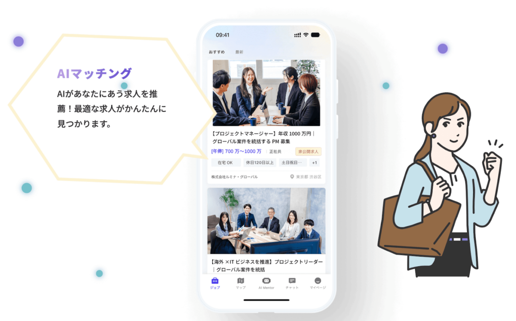 AIがあなたの経歴や希望を分析し、のんびりした性格にマッチする求人を提案してくれます。