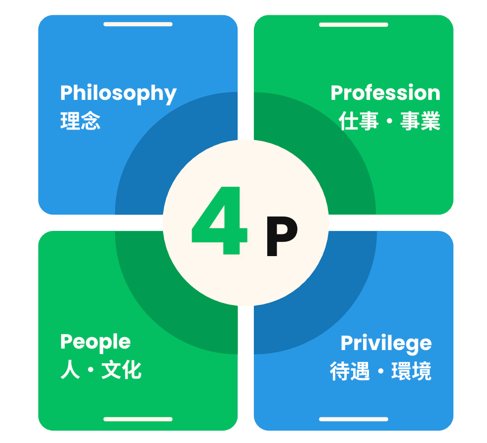 自社の魅力を「Philosophy(理念)」「Profession(仕事)」「People(人)」「Privilege(待遇)」の4つの要素で構造的に整理し、一貫性のあるメッセージとして求職者に届ける手法です。