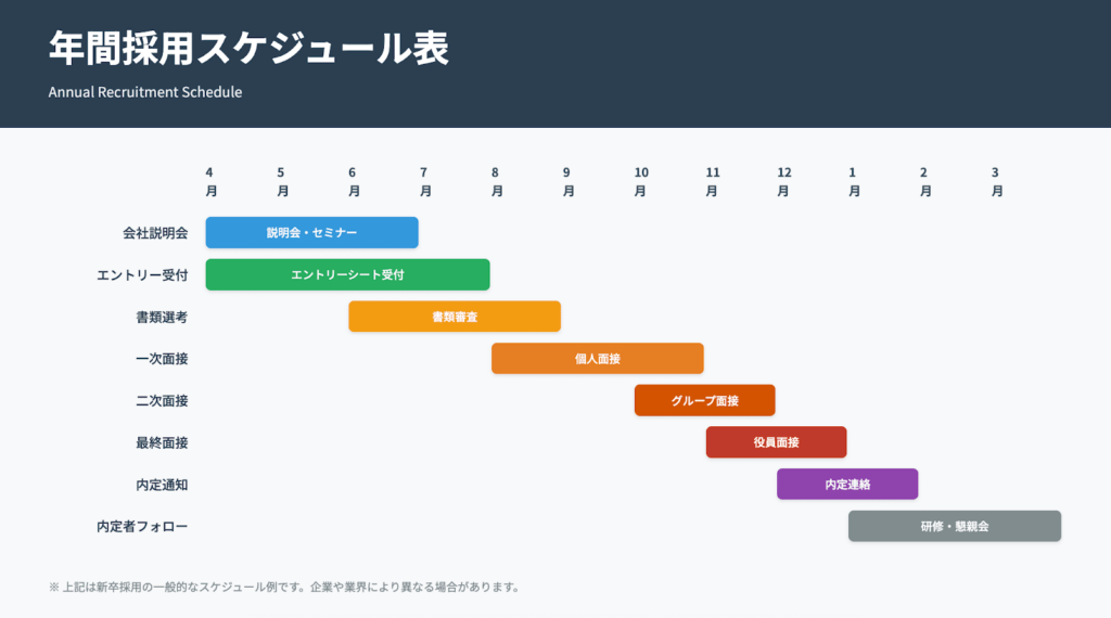 採用スケジュールは、採用活動全体の工程と期間を定めた計画表です。