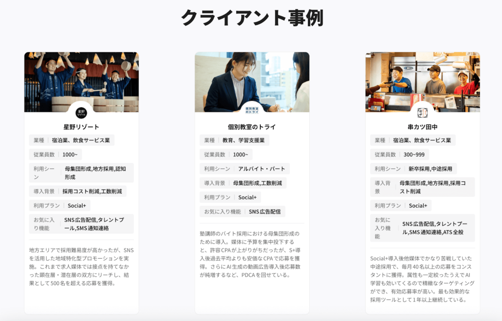 | 難職種でも採用実績あり | 飲食店の店長候補や地方ドライバーなど、採用が難しい職種でも成功事例がある |