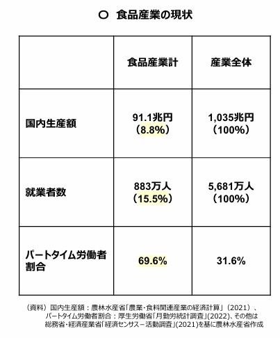 農林水産省の資料によると、全産業のパートタイム比率が30%台であるのに対し、食品産業は約70%です。