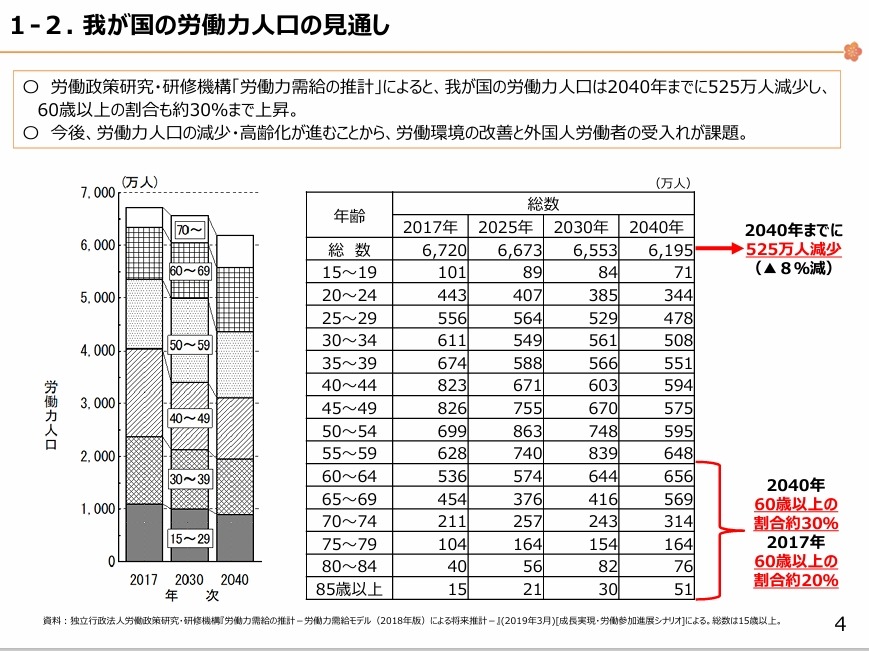 2017年の日本の労働力人口と比較して、2040年には525万人も減少する見込みです。